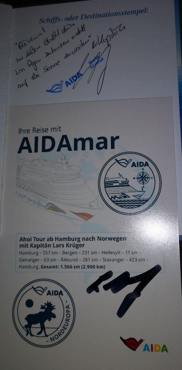 Ich habe dann, als es das erste gab, die ersten 7 Reisen eingetragen und versucht die Unterschrift vom Kapitän, wenn er auf einer weiteren Reise auf dem Schiff war und vom Schiff einen Stempel, zu bekommen. Hat auch für alle Reisen geklappt, außer die Unterschrift von Nico Berg für die Jungfernfahrt der Stella vom17.03. - 28.03.13 fehlt mir, der hatte Aida verlassen.