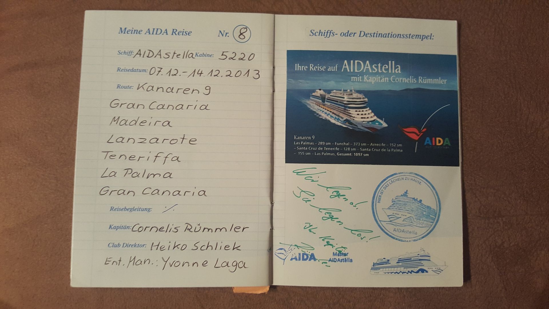 Ich habe dann, als es das erste gab, die ersten 7 Reisen eingetragen und versucht die Unterschrift vom Kapitän, wenn er auf einer weiteren Reise auf dem Schiff war und vom Schiff einen Stempel, zu bekommen. Hat auch für alle Reisen geklappt, außer die Unterschrift von Nico Berg für die Jungfernfahrt der Stella vom17.03. - 28.03.13 fehlt mir, der hatte Aida verlassen.