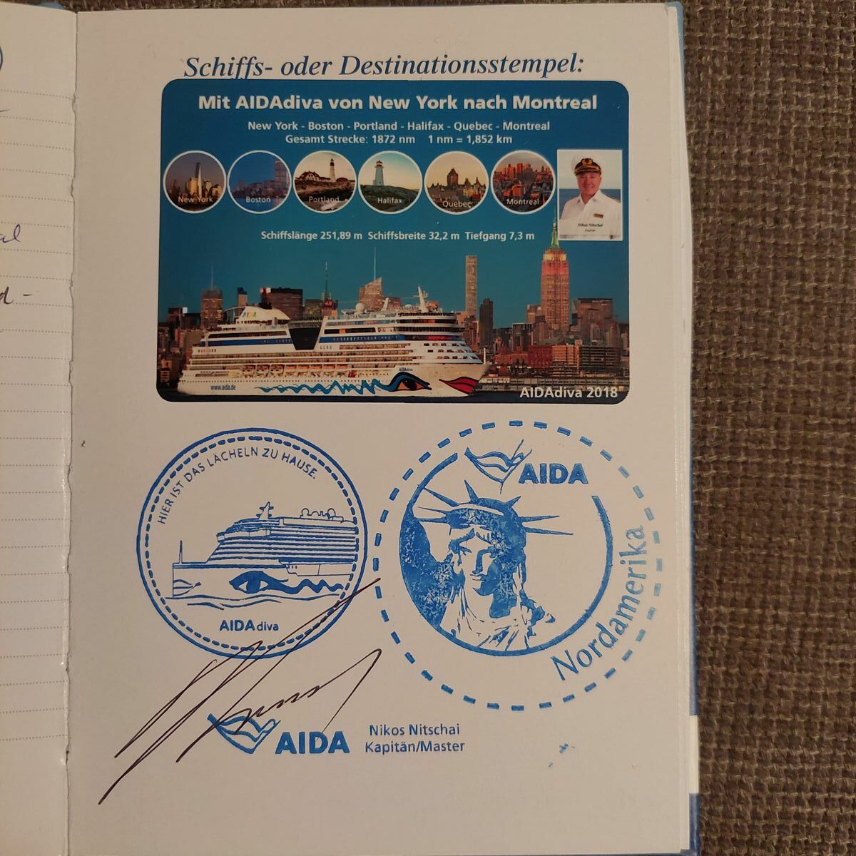 Auch ich habe erst nach einigen Reisen ein Logbuch gekauft . Mein Mann hat mir die Aufkleber am PC selbst erstellt . Gibt hier im Faden glaube ich auch Anmerkungen dazu . Bei unserer Reise im Mai habe ich höflich an der Rezi nach Stempeln gefragt und die freundliche Mitarbeiterin hat viele passende Motive dazu gehabt . Z.B. für die Kanaren , die Ostsee, Orient ,Norden usw. Da ich immer die Aida heute mit nach Hause genommen habe, konnte mein Mann die Destinationen incl.Seemeilen im Aufkleber eintragen.