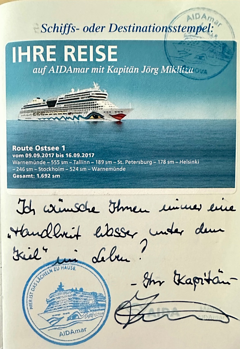 Mit Buch abgeben und nach ein paar Tagen auf der Kabine wieder finden fand ich es zwar schöner, irgendwie hatte man da mehr das Gefühl, dass es für einen persönlich gedruckt und unterschrieben wurde. Teils auch mit "persönlichen" Worten vom Kapitän, also nicht nur die Unterschrift. Jetzt fühlt es sich mehr wie Massenabfertigung an (was es ja letztlich ist...) ![]()