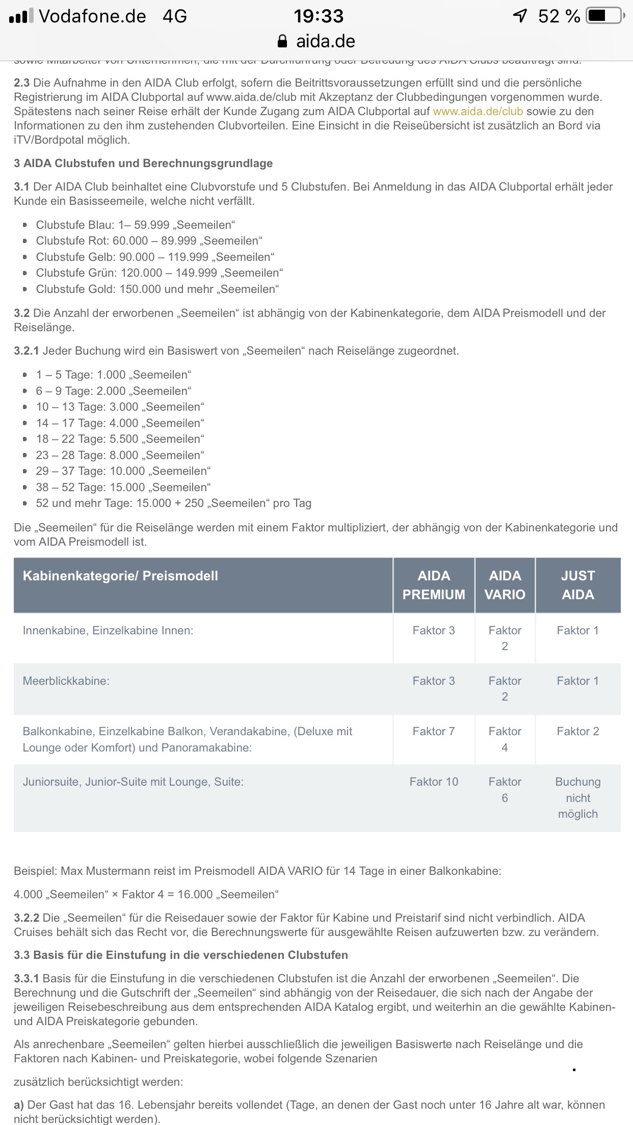 Wir fahren schon jährlich, meist 10 oder 14 Tage aber halt Vario ,dafür aber immer Balkon und die Seemeilen purzeln trotzdem. Uns z.Bsp. wurden zu Beginn 2015 ja so gut wie eine gesamte Clubstufe gestrichen ( Gelb) und danach richtet sich nun der jährliche Verfall.