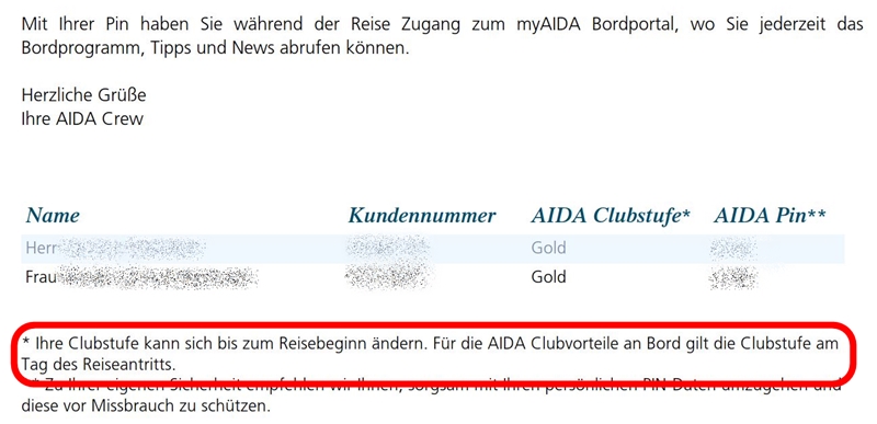 Im Aida Club steht die Angabe wie sie sein sollte.