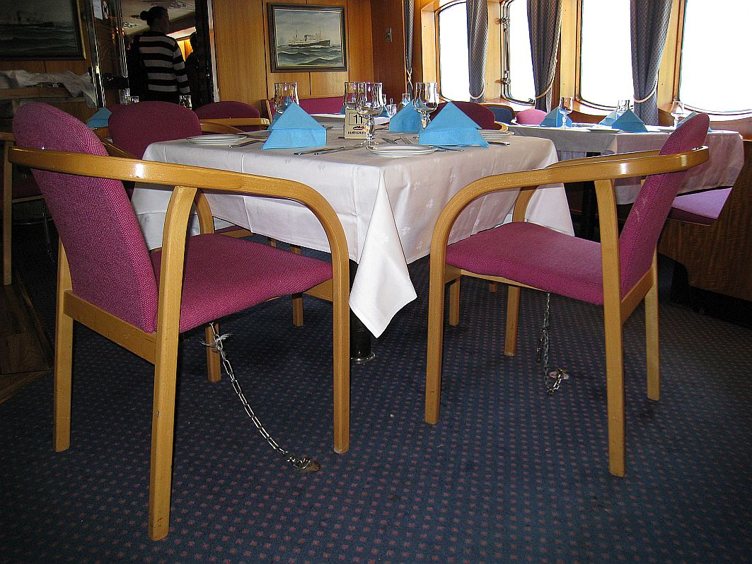 Ein Blick ins kleine Restaurant. Falls die See mal rauer ist (was ja in einigen Seegebieten auf dieser Route gar nicht so unwahrscheinlich ist), sind die Stühle vorsichtshalber immer angekettet: