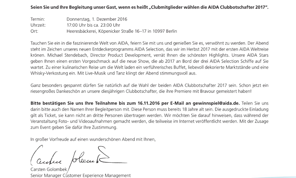 Einladung von Aida nach Berlin zur Wahl der Clubbotschafter 2017