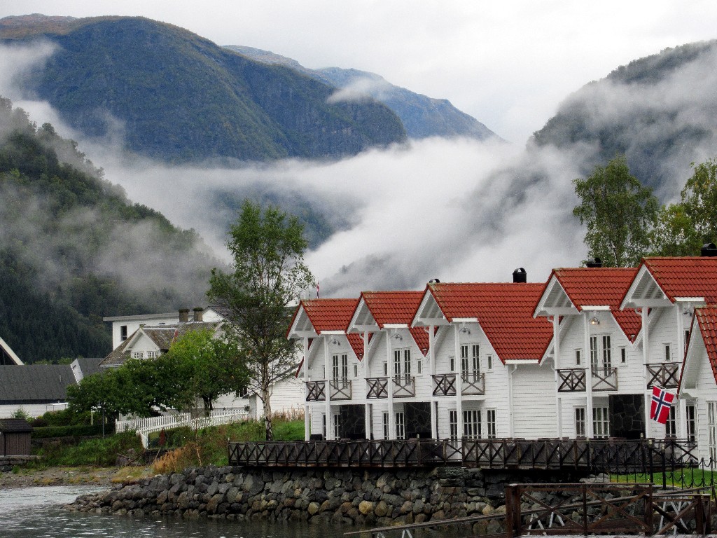 Skjolden unter einem azublauen Himmel mit Schönwetterwolken