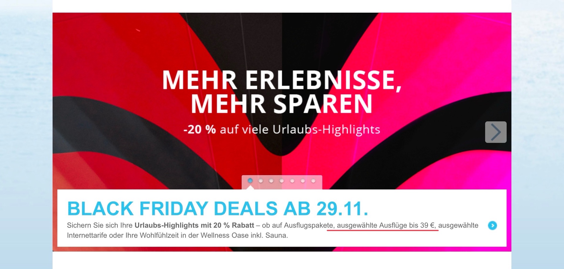 Mir wurde gerade für ca eine zehntel Sekunde ein Ausflug mit einem „Black Friday Deal“-Fähnchen angezeigt. Der war aber sofort wieder weg. Unabhängig davon werden mir aber mehrere Ausflüge mit 20% Rabatt angezeigt - das ist auf jeden Fall neu. Und das ist kein Paket, sondern Rabatt für einzelne Touren.