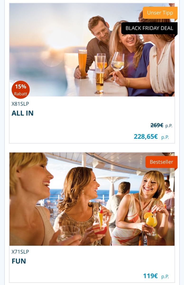 Genau das sehe ich auch für unsere beiden Reisen, die eine nächste Woche mit der sol, die andere im Juni 2026 mit der luna. Und dort gibt es noch das AllIn mit 15%. Ansonsten: nichts!