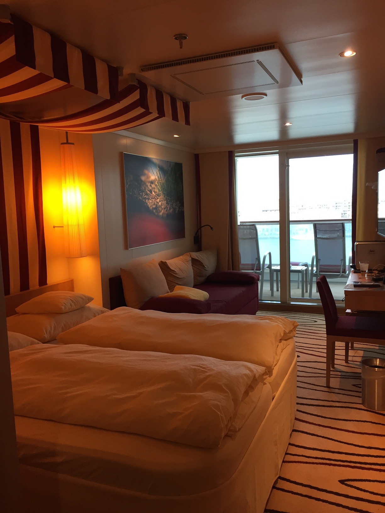 Wir waren vom 3.12.-10.12.2016 in der Kabine 11139 auf der AIDA Prima. Die Kabine befindet sich Steuerbord ziemlich in der Mitte der halbrunden Ausbuchtung über dem Theatrium. Die Steuerbord Lage bedeutet auf der Tour der AIDA Prima, dass man am ersten Seetag zwar keine Sonne auf dem Balkon hat. Aber dafür hat man von den meisten Häfen einen schöneren Blick als auf der Backbord Seite. Bei unserer Kabine 11139 handelt sich um eine Verandakabine Komfort mit begehbarem Kleiderschrank, die wir Premium gebucht hatten.