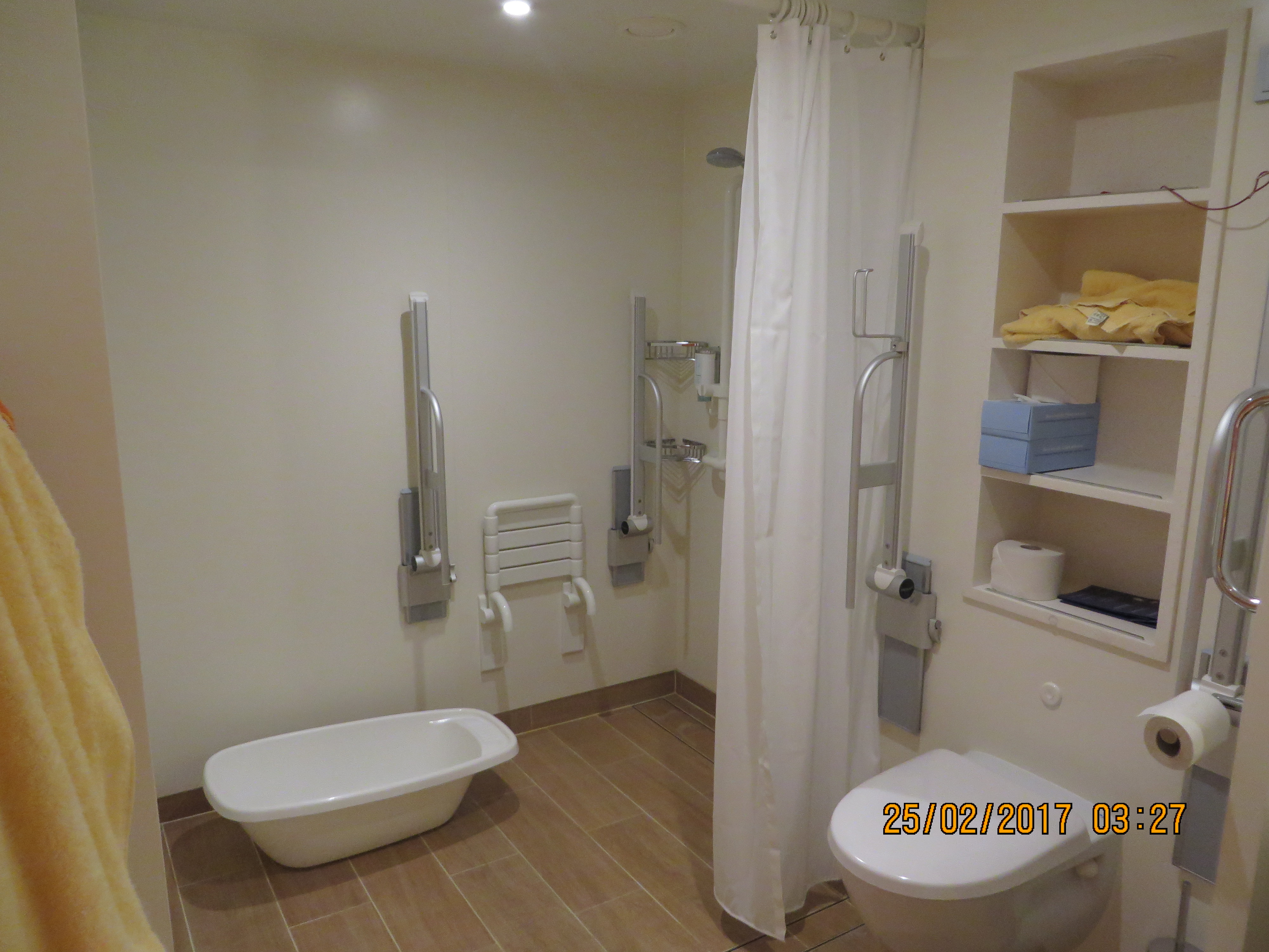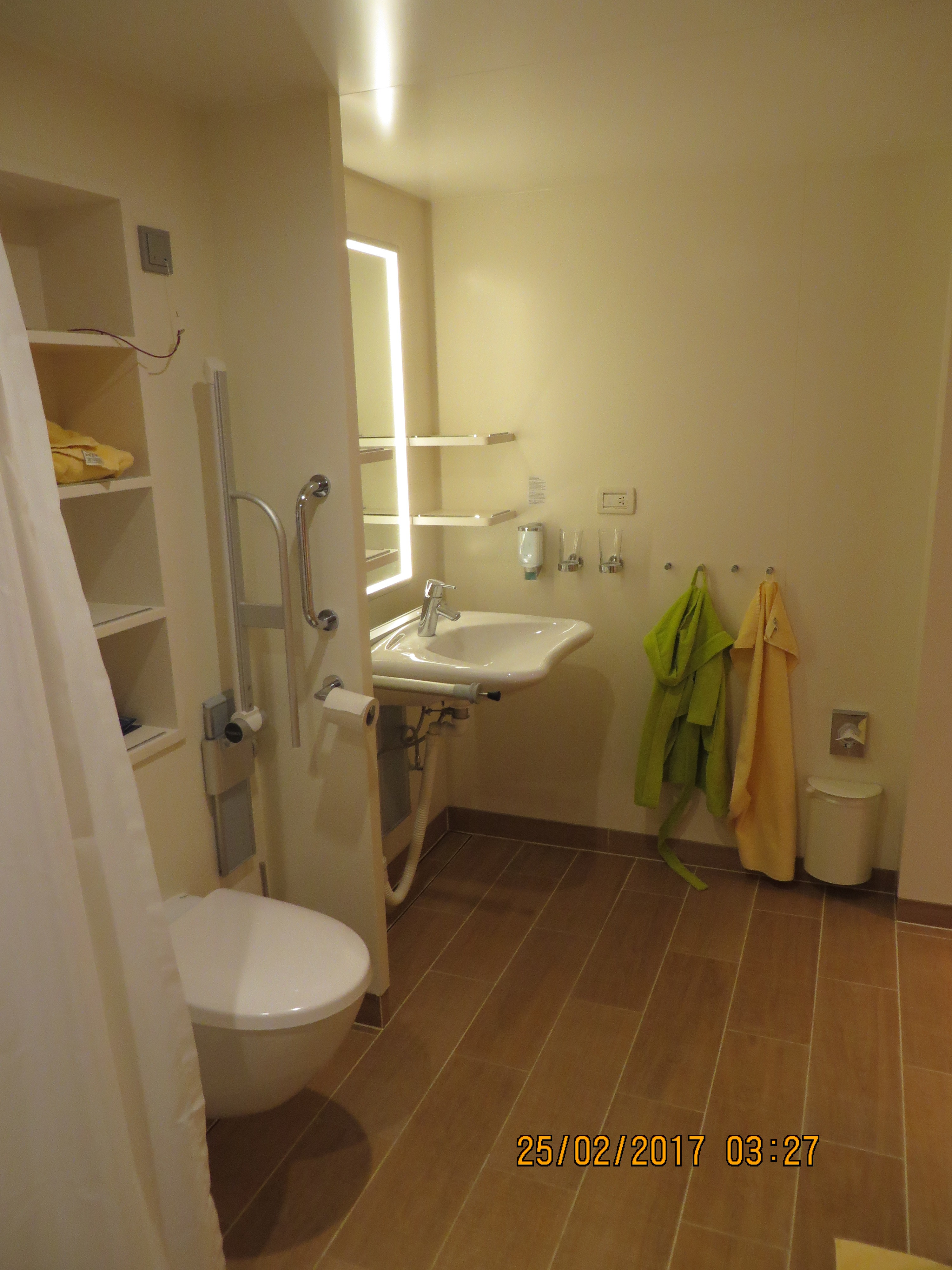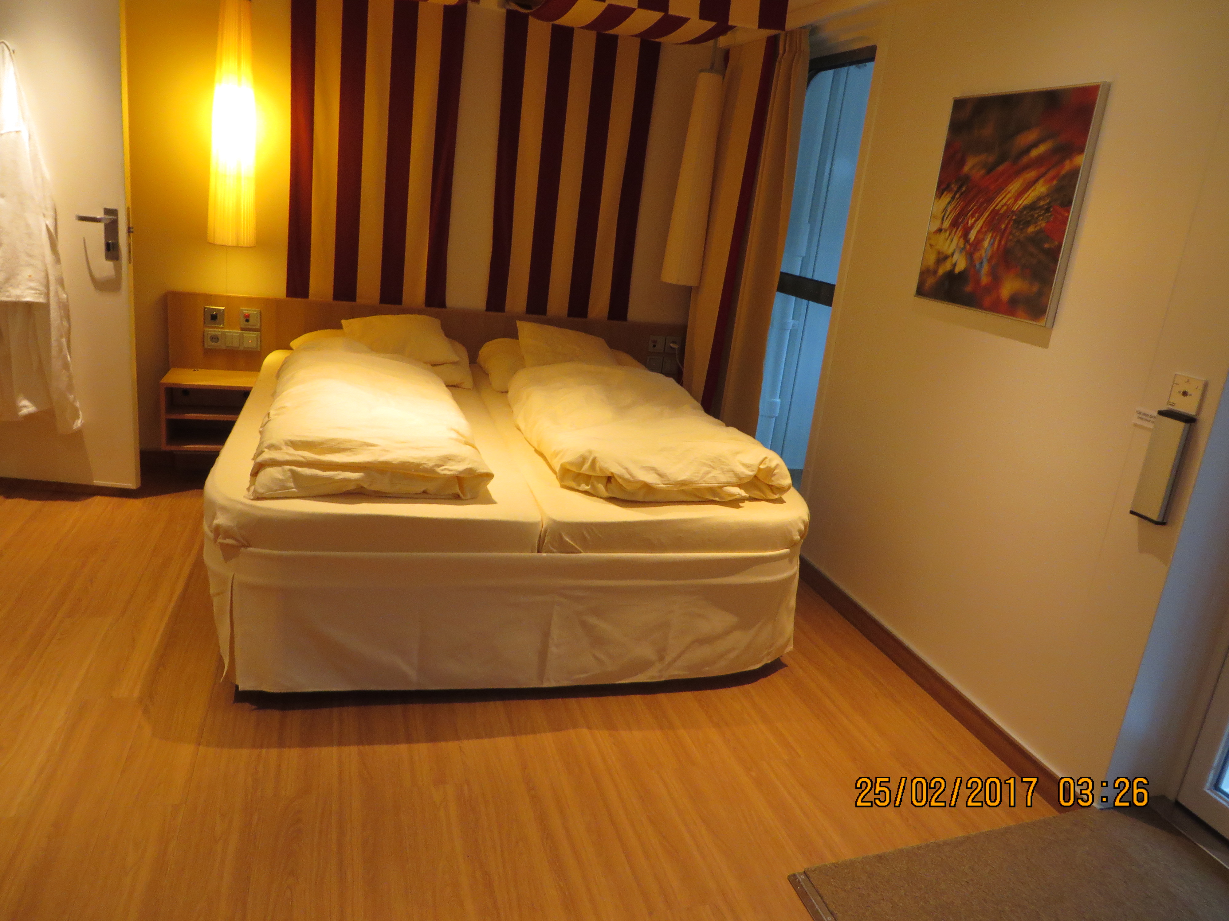 Das Doppelbett steht in Fahrtrichtung. Sie hat ca. 31 qm. Der Balkon hat über 12 qm. Die eine Hälfte des Balkons hat eine Stahlbrüstung, die andere Hälfte eine Glasbrüstung. Die Beschreibung vom Deckplan stimmt somit nicht ganz, dort wird nur Stahlbrüstung angegeben. Der Boden ist mit Laminat ausgelegt, da sie ja eigentlich für Rollstuhlfahrer ist. Alle Türen gehen per Knopfdruck automatisch auf. An der Kabinentür ist eine Klingel. Wenn man diese betätigt, erleuchtet innen auch ein Lichtsignal, so dass sie auch für Gehörlose geeignet ist.Sie ist sehr leise, vom an- oder ablegen hört man nichts.