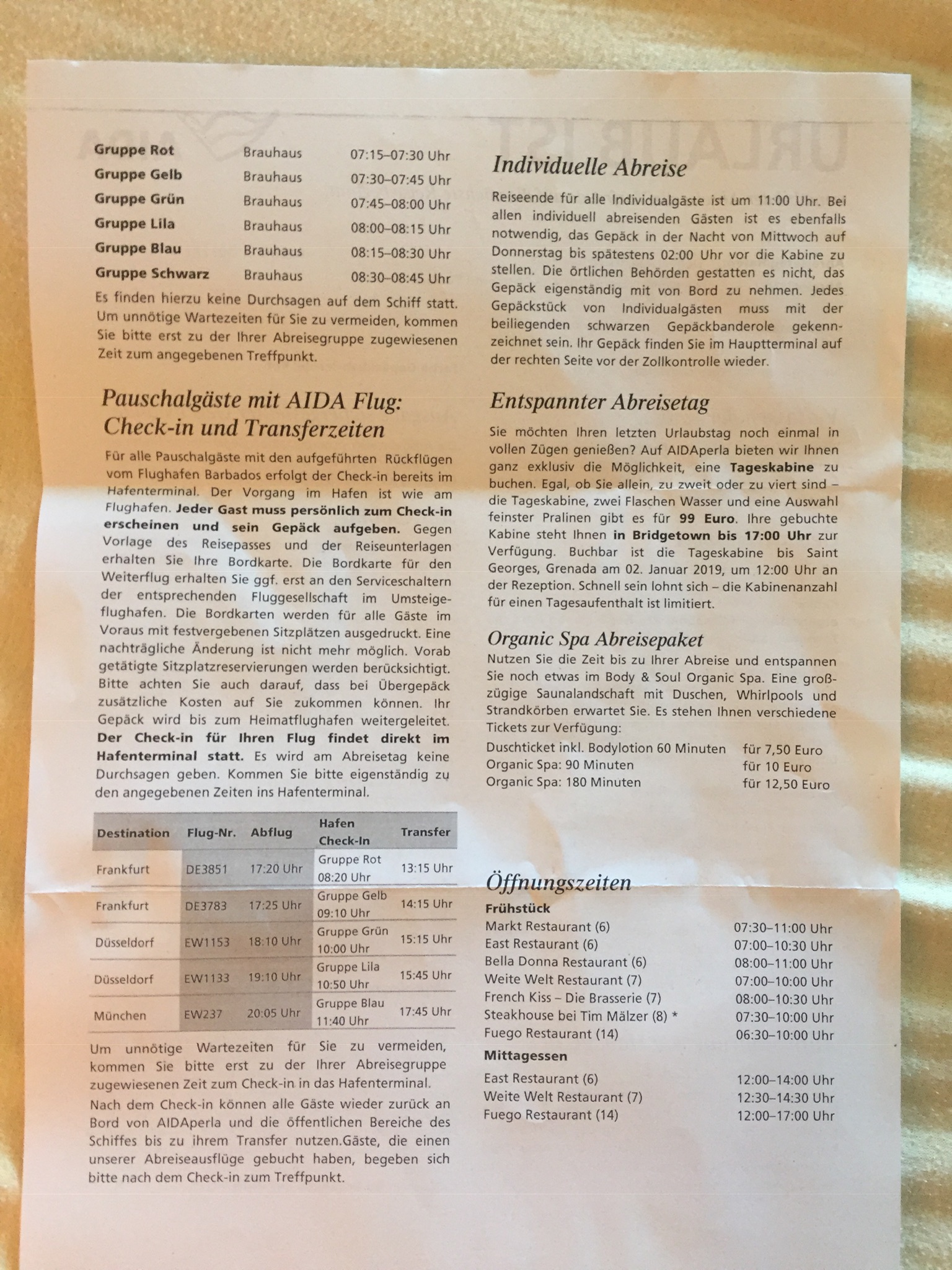 Transferzeit zum Flughafen ab Hafen war um 13:30 für den Flug nach Düsseldorf um 17:10. Wir kamen auch 1 1/2 Stunden verspätet weg. Grund: Frischwasser konnte wegen eines defekten Fahrzeugs nicht aufgenommen werden. Außerdem stimmte wohl die Anzahl der Reisenden auf der Passagierliste nicht mit der Anzahl der Gäste an Bord überein. Es musste mehrmals durchgezählt werden, bis der Fehler gefunden wurde. Jedenfalls war es anstrengend für alle bis wir weggekommen sind.