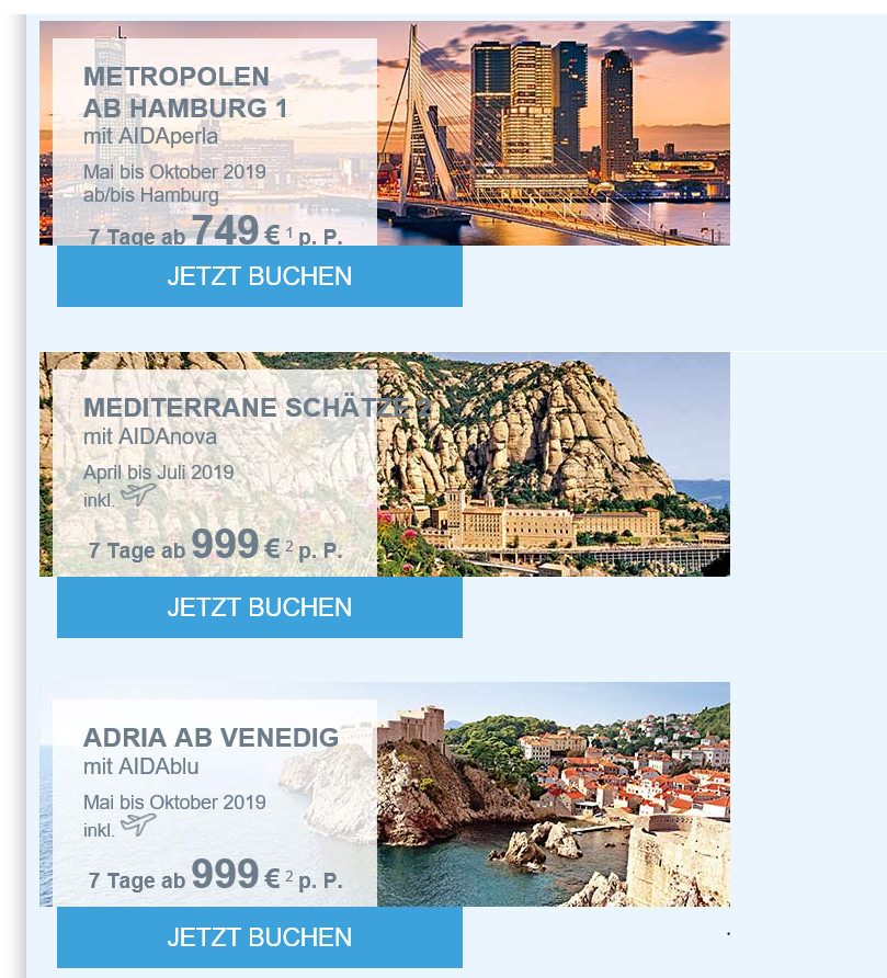 Die Routen sind nun auch sichtbar: Kurzreise nach Norwegen und Dänemark, Metropolen ab Hamburg, Mediterrane Schätze und Adria ab Venedig. Also nichts für uns