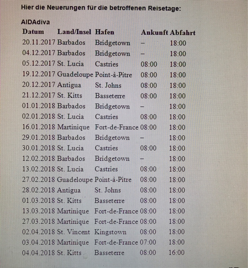 Dann gibt es Infos zum Routenverlauf, die ich erhalten habe. Es gab auch eine Info, dass die Info postalisch an die Gäste der Reise am 29.09. rausgegangen sein soll, an die Agenturen am 30.09. - wir warten mal. Post dauert bei AIDA in der Regel relativ lange. Bis morgen gebe ich ihnen noch. Nichts desto trotz habe ich heute eine Email an die Beschwerdestelle geschrieben, denn es gibt immer wieder andere Aussagen. Meine letzte Info als Reiseagentur habe ich bekommen (allerdings auch nur, weil ich Kunden habe, die schon ab dem 17.03.2018 an Bord sind sowohl welche, die vom 11.03. - 25.03. die Tour machen) mit folgenden Infos im Dateianhang.