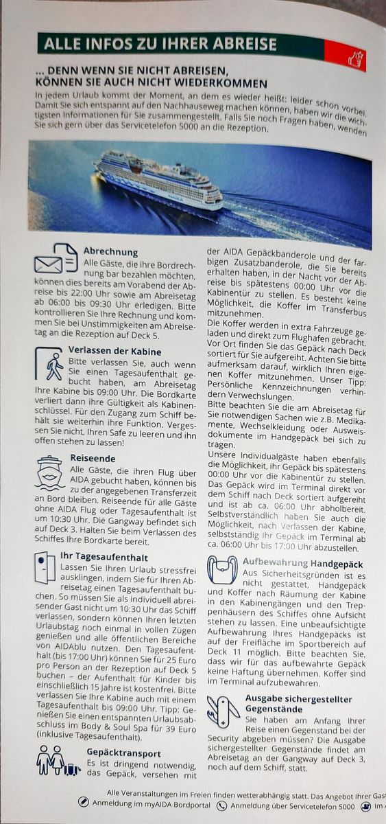 Ich war Ende 2023 unterwegs, wir hatten allerdings einen frühen Rückflug. Ich kann anbieten, dass ich heute Abend zuhause in der alten AIDAheute nachschauen kann, wie es damals war.