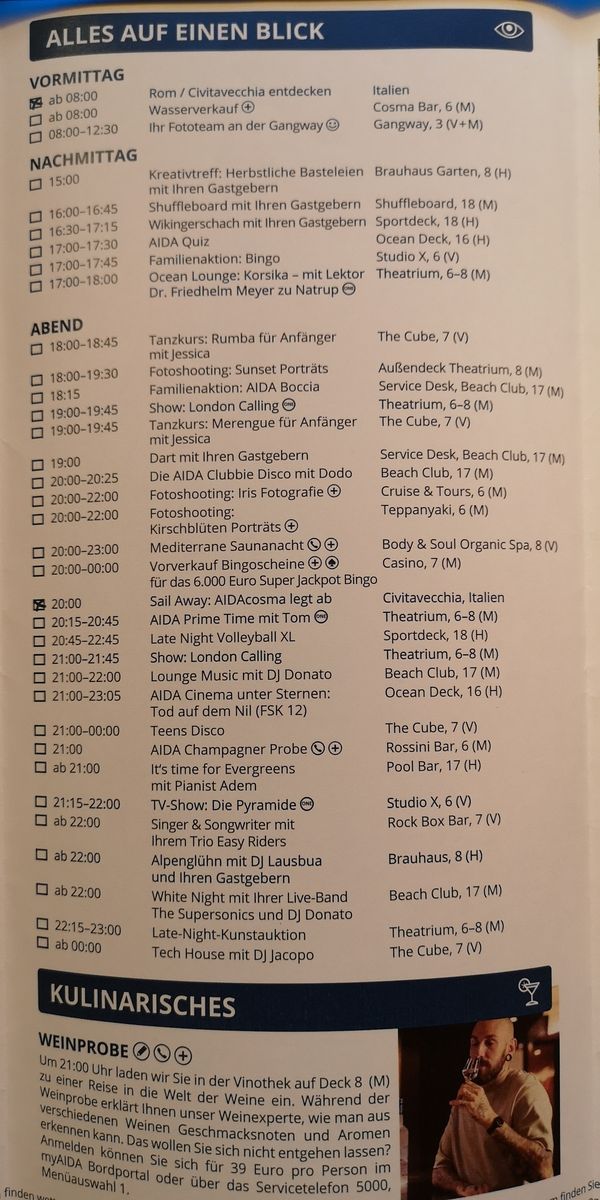 Wobei ich mich frage, wie groß das Einsparpotenzial für Aida ist, wenn sie nur noch eine Show pro Abend anbieten. Ich habe keine Ahnung, wie das Ensemble bezahlt wird, aber sie sind ja ohnehin 24/7 an Bord.