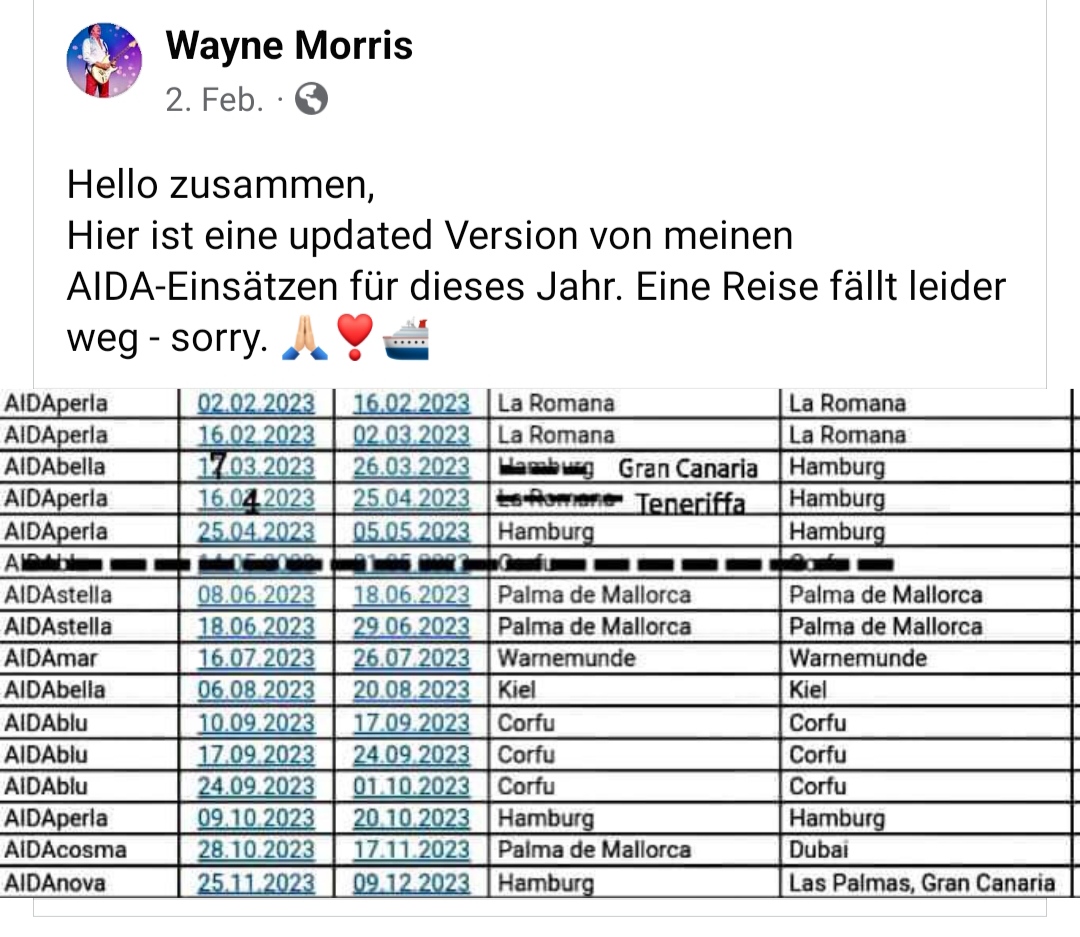 Weiß jemand, auf welchen Reisen Wayne Morris ab Oktober 2023 dabei ist?