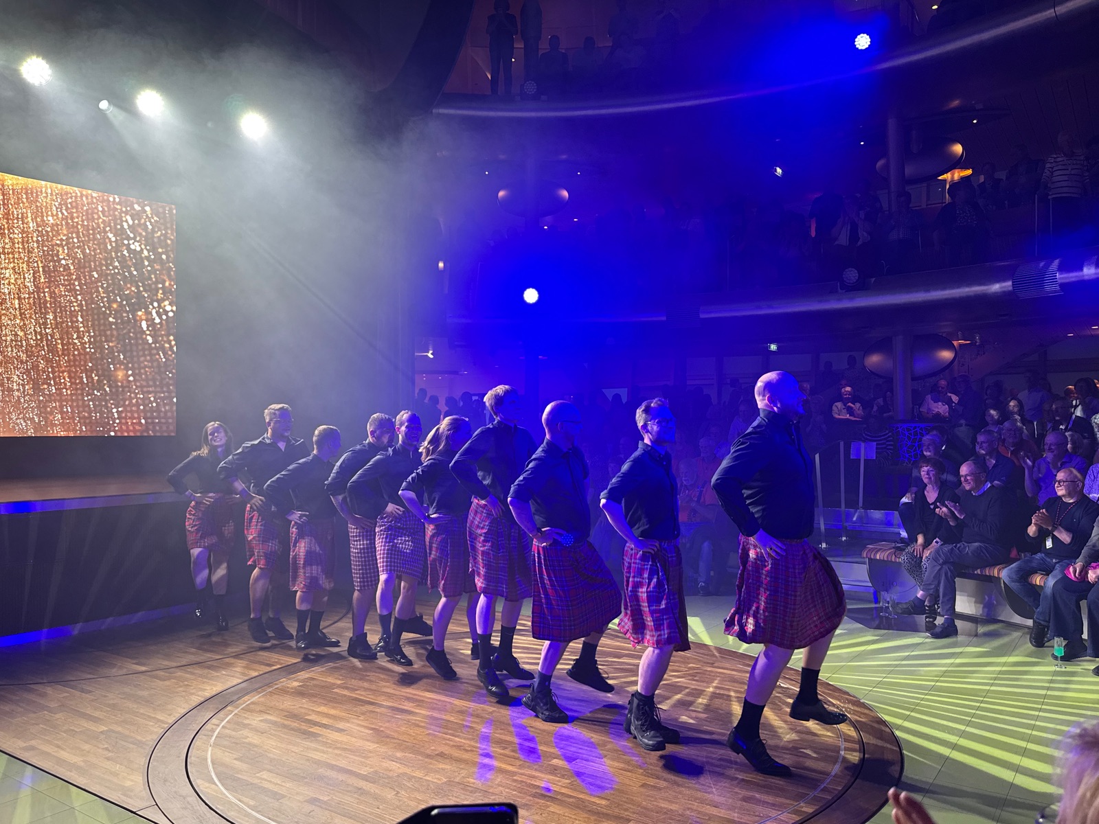 Bei der Verabschiedungsshow auf der sol (Norwegen-Schottland) gab es gestern ein Highlight, der Theatermanager „Lord Patrick“ (dienstältester Schotte an Bord) trat am Ende in waschechtem Outfit auf und flötete auf einer kleinen Flöte ein altes schottisches Lied, mit Gesangseinlage von ihm. Das ansich war schon sehr stimmungsvoll und schön, aber die Krönung war dann „Lord of the Dance“ (ist zwar irisch aber egal). 10 Crewmitglieder hatten eine Choreo (von ihm?) aufgeführt, die das Publikum dann zu drei Zugaben getrieben hat, so dass es viermal getanzt wurde, was sichtlich anstrengend aber war auch sehr spaßig für sie war, das war mal richtig klasse gemacht und wurde auch so gefeiert.