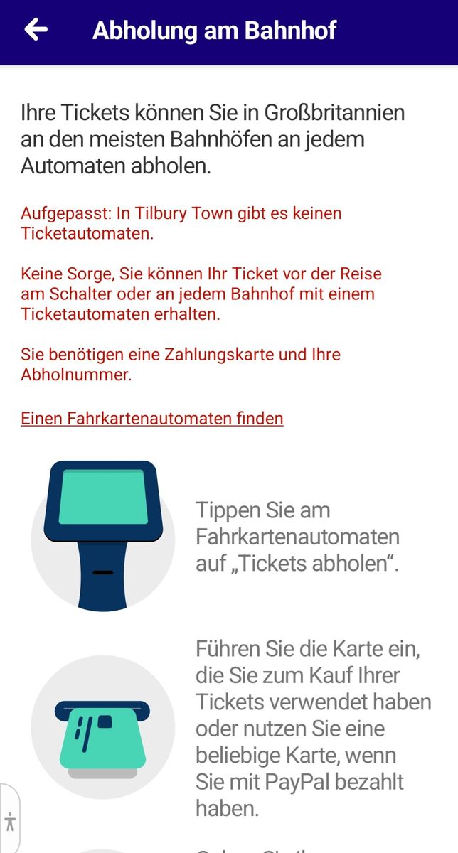 beim Durchspielen des Bezahlvorganges ist mir aufgefallen, dass es in UK nach der Bezahlung nur die Möglichkeit des Abholen des Tickets am Ticketautomaten gibt. Nun gibt es in Tilbury aber keinen Ticketautomaten.