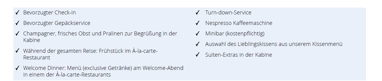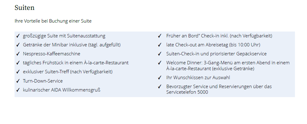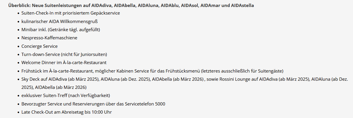 Ich glaube eher dem, als was irgendwo sonst wo im Netz steht. Wenn es zusätzlich noch den Frühstücks-Service und andere Leistungen mehr gibt, dann ist das natürlich Klasse, aber ich kann mir vorstellen, dass Aida mit dem Umbau der Schiffe vielleicht gewisse Goodies für Suiten streicht.