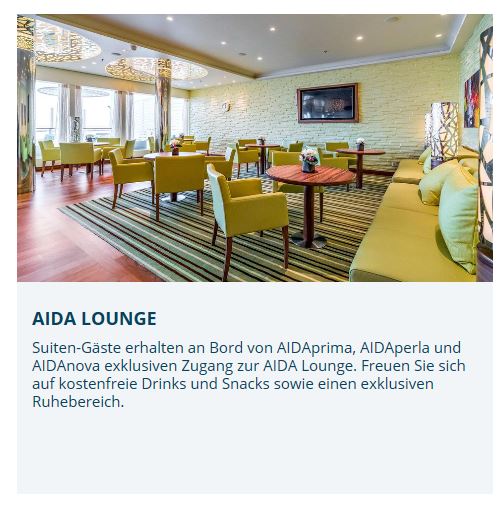 "Wir möchten unseren Gästen der Juniorsuiten aber bereits auch auf allen aktuellen Reisen die Möglichkeit geben, in den Genuss der mit dem Zugang zur AIDA Lounge verbundenen Extraleistungen zu kommen. Daher werden die Getränkepakete in der Übergangsphase ab sofort nicht mehr automatisch ausgehändigt, sondern der Gast wird durch uns schriftlich bis zum Katalogstart über die neuen Serviceleistungen informiert.Sollte er den Wunsch haben, auf den Lounge Zugang/Patiodeck/Conciergeservice zu verzichten, stellen wir ihm als Alternative selbstverständlich an Bord die Getränkekarte für Juniorsuiten zur Verfügung.