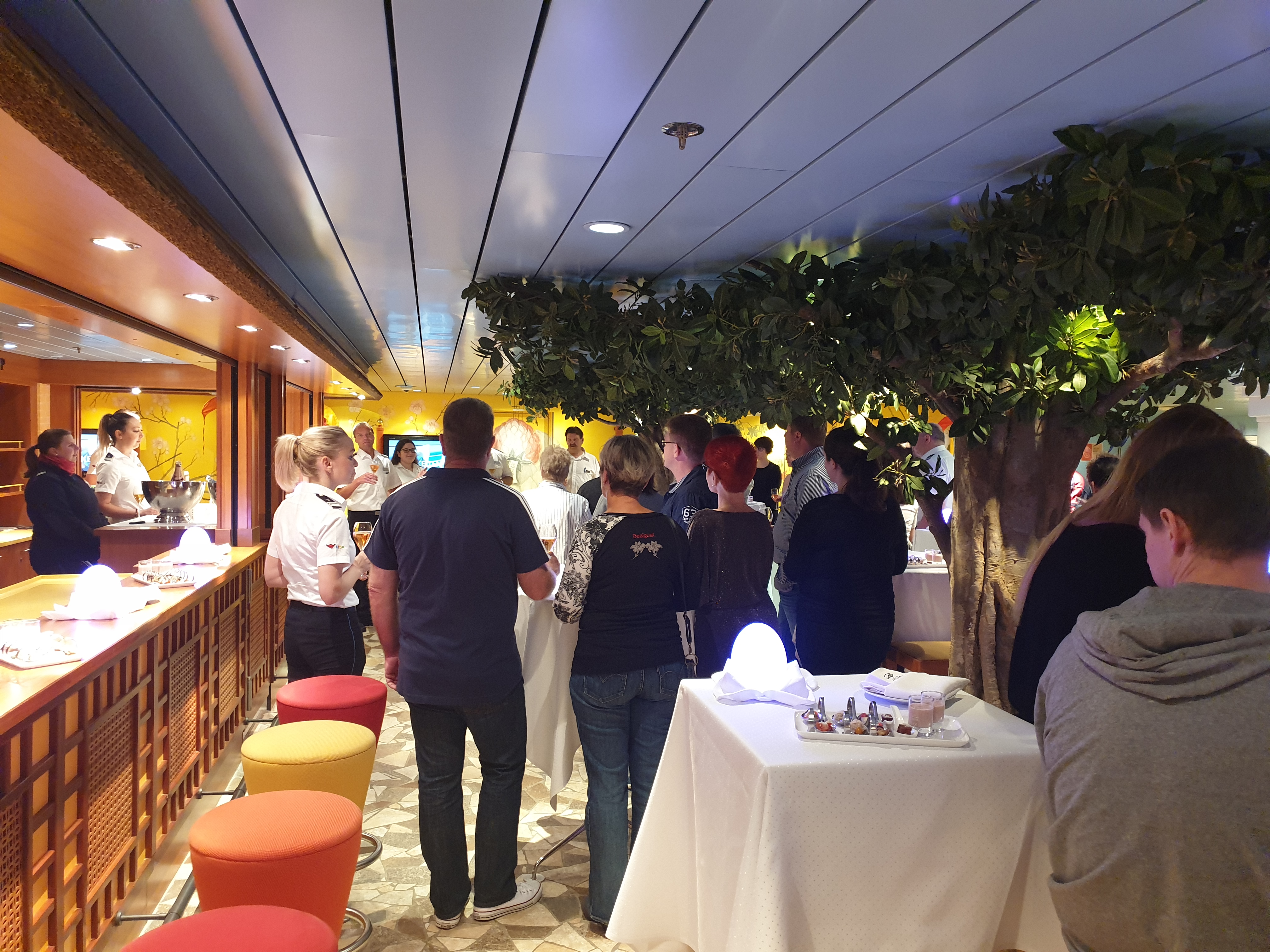 Suitentreff ist meist eine Veranstaltung an einem besonderen Ort auf dem Schiff mit Schnittchen und Getränken. Dazu gesellen sich viele Offiziere, GM, Kapitän, etc.