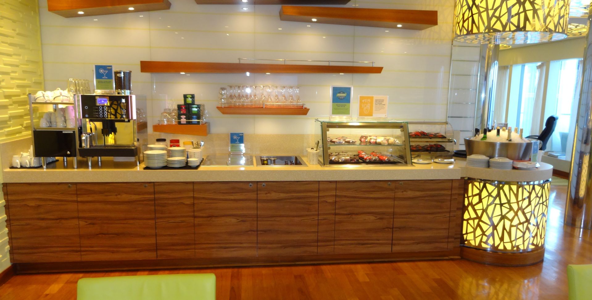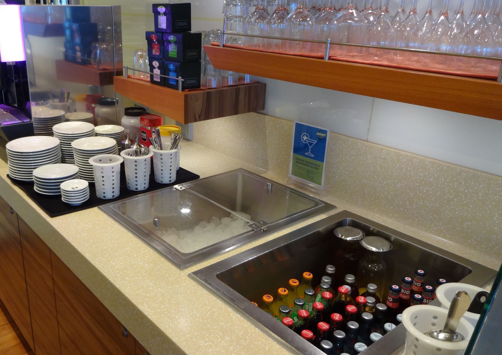 - was in der Lounge an Getränken und Häppchen angeboten wird