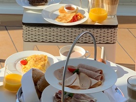 - Frühstück auf dem Balkon (mehrfach genutzt. Stets etwas vor der Zeit geliefert)