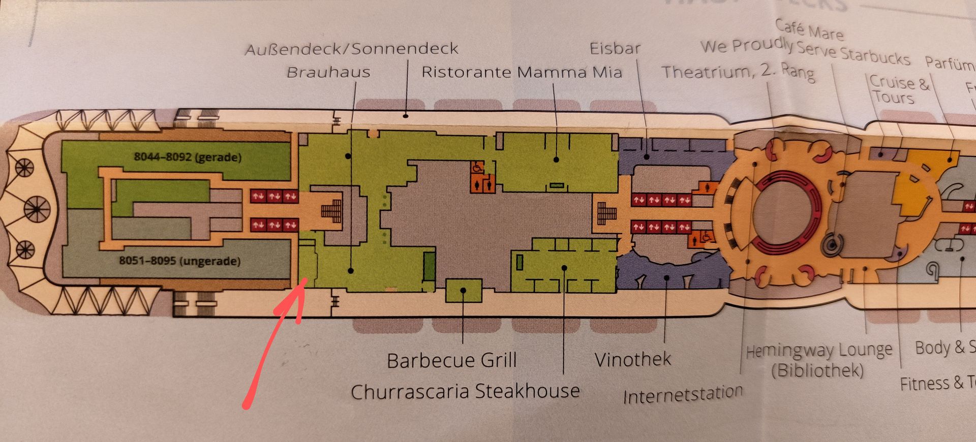 Dankeschön. Hoffentlich weit genug hinten, dass es in unsere Kabine nicht zu laut wird, die liegt genau am Rand zum Brauhaus, allerdings steuerbord.
