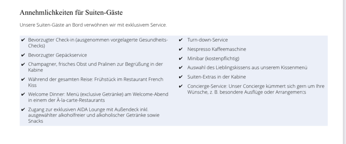 Und bitte dran denken, mir wurde mitgeteilt, dass vor kurzem die Buchungsbestätigungen sich geändert haben (vor ein paar Tagen) und AIDA nun eine Anfrage in die Fachabteilung gegeben hat, ob die SC Suiten im French Kiss frühstücken oder ob es sich um einen Fehler in der (neuen) Buchungsbestätigung handelt.