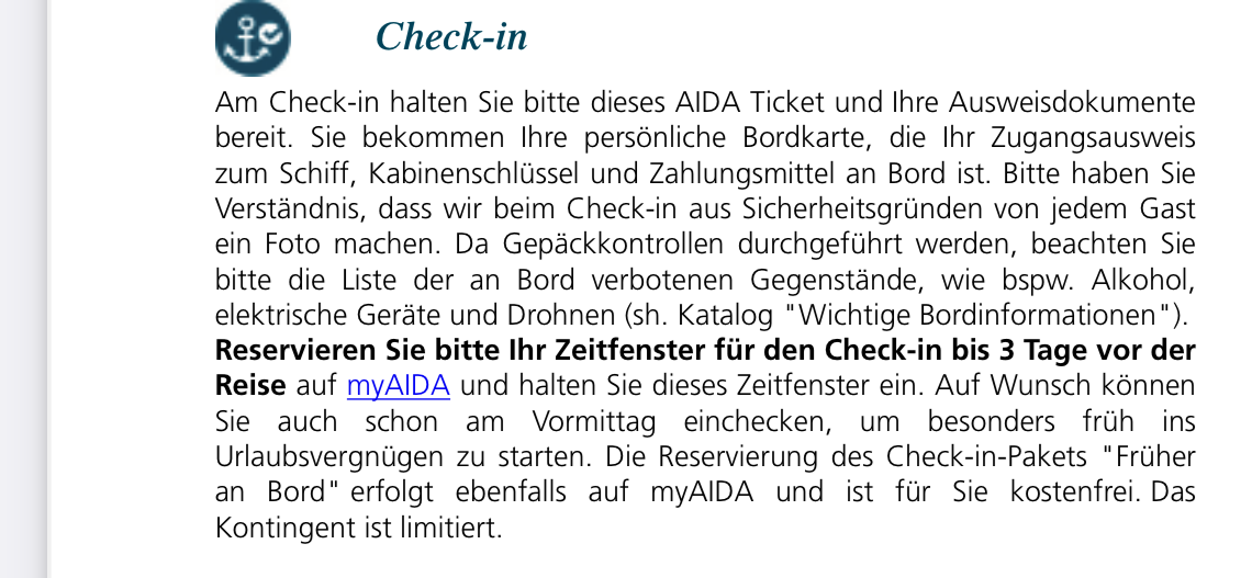 ich finde immer wieder widersprüchliche Aussagen zum Check in. Laut Auskunft der Hotline bei Aida, muss man nur pro Forma ein Zeitfenster eingegeben. Egal ob Suite oder JS, man könne definitiv ohne Aufpreis früher an Bord. Irgendwie habe ich da aber so meine Zweifel. Wer hat das aktuelle Erfahrungen?