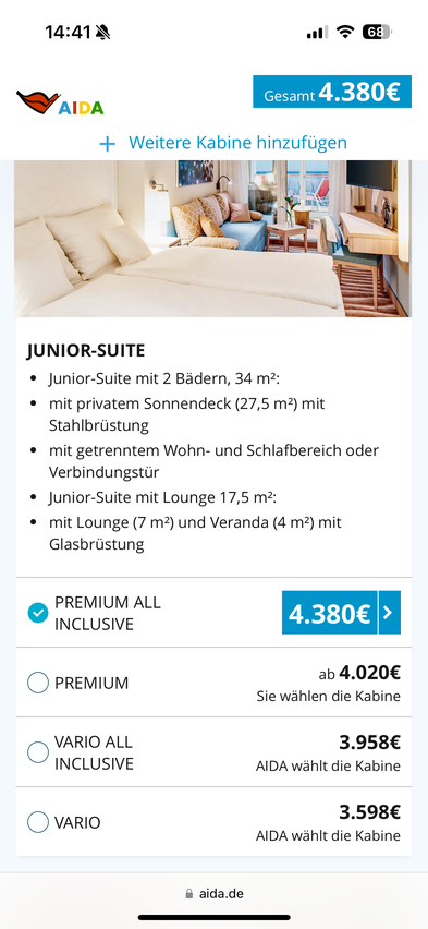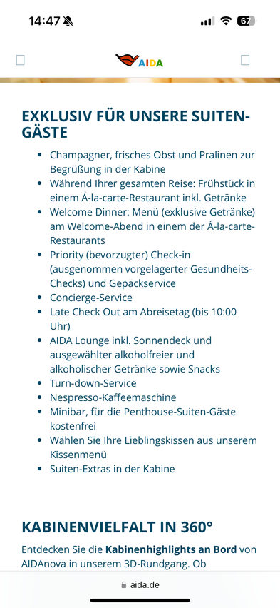 Ich habe auf der Aida Seite zwei verschiedene Übersichten zu den Suiten Leistungen gesehen.