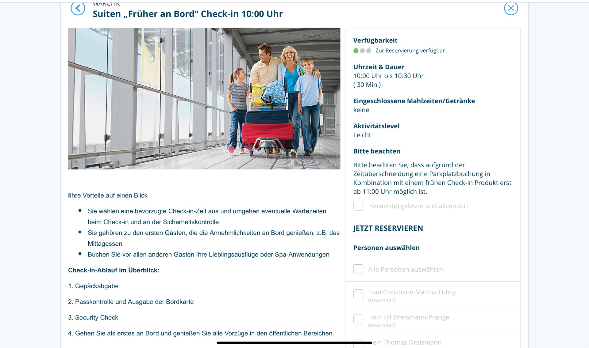 Das Angebot ist bei Buchung einer Suite bei Reisen ab Deutschland ist sofort verfügbar. Meine Reise findet Ende August statt und ich habe Anfang Januar gebucht und konnte sofort den Checkin reservieren. Kostenlos „Früher an Bord“ gilt aber nur für Suiten und nicht für Juniorsuiten.