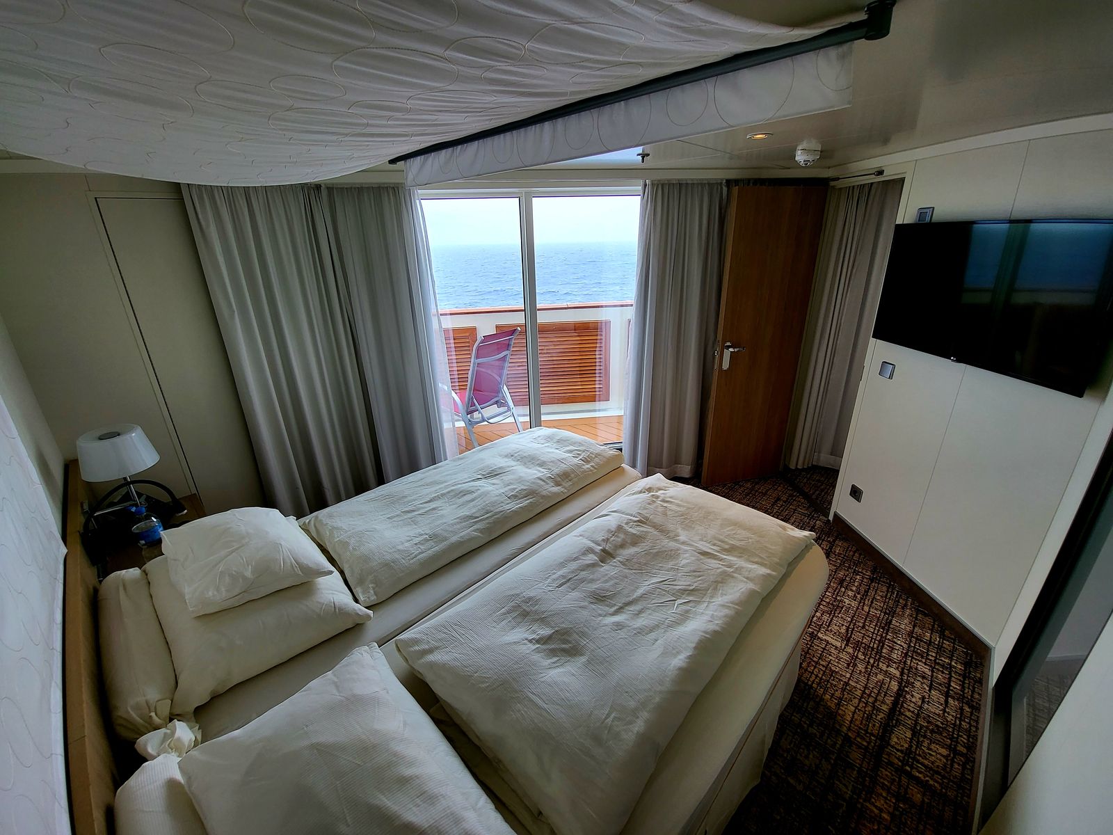 Leider haben die JA Suiten auf der Nova nur eine relativ hohe Stahlbrüsting. Im Sitzen oder auf der Liege ist der Ausblick gegen diese Stahlbrüstung nicht so prockelnd.
