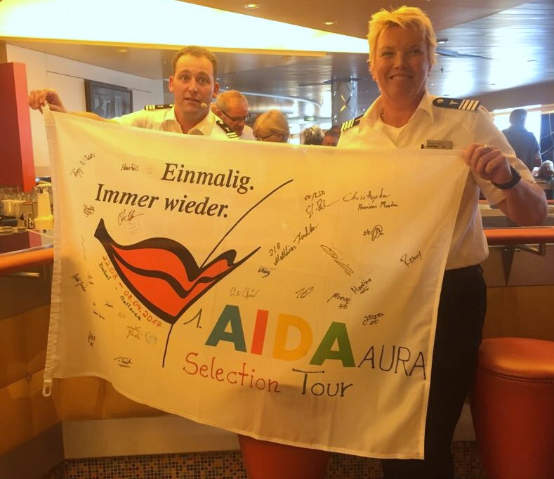 von der ersten Selection Reise mit der AIDA AURA 2017 (22.03 - 08.04.2017) haben wir ein besonderes Souvenir mitgebracht: Eine von Kapitän Sven Laudan, General Managerin Silvia Fürst, Entertainment Manager Thorsten Jost und vielen Offizieren handsignierte und gestempelte AIDA Fahne. Ihr habt die Möglichkeit, diese einmalige Fahne in E-bay zu ersteigern.
