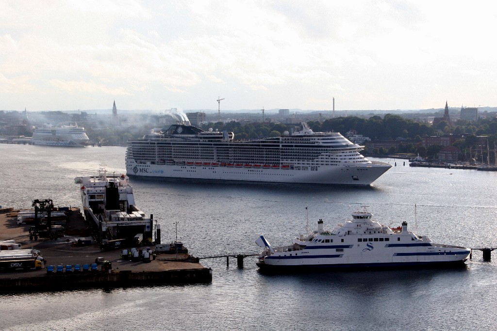 Die MSC Preziosa während ihrem Auslaufmanöver um 18:29h auf der "Kieler Förde" und die AIDAluna am Ostseekai (Liegeplatz 28)