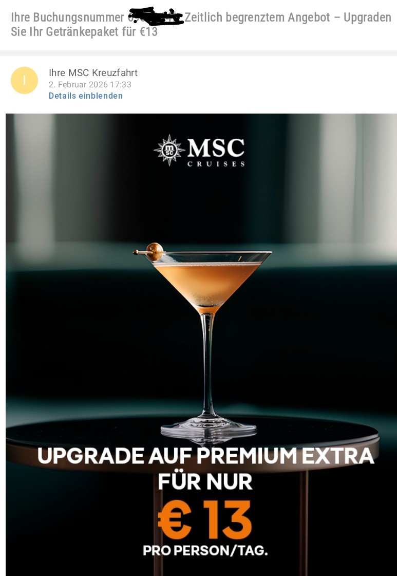 Wir haben heute eine Mail von MSC bekommen, lt. der uns ein Upgrade von easy auf Premium für 15 Euro angeboten wird. In der Mail steht auch unsere Buchungsnummer und die geplante Reise. Wenn ich dann auf den Button „jetzt buchen“ gehe und in MSC for me weitergeleitet werde, Steht da 448 Euro pro Person! Kann es sein, dass der Preis in der App nicht angepasst wurde? Hatte das schon mal jemand?