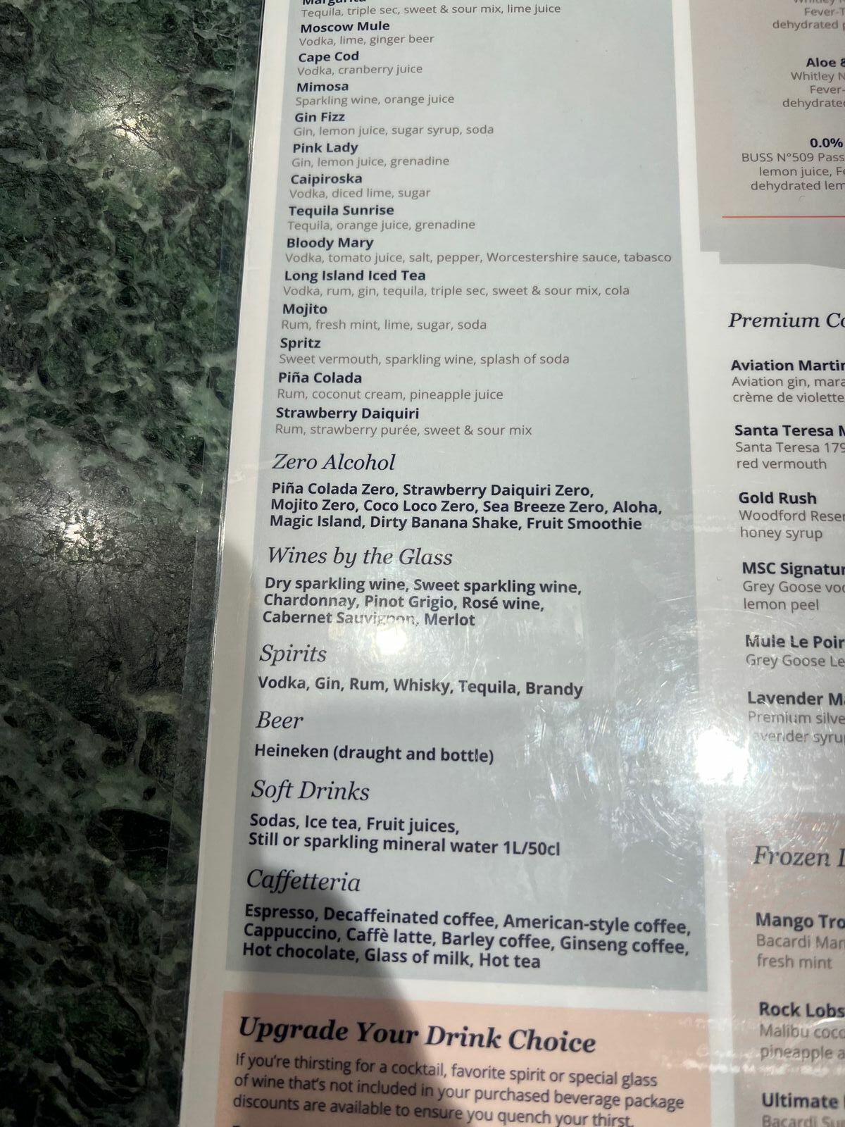 Es gibt aber auch sehr viele Cocktails für 10 Euro oder weniger, zumindest habe ich das so auf meinen bisherigen MSC Kreuzfahrten erlebt. Ich hatte noch nie einen Cocktail für 14 Euro und ich war schon mehrfach auf der MSC.
