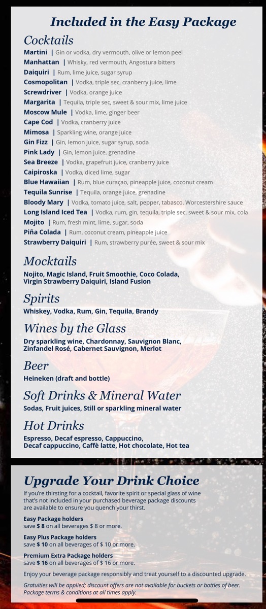Das kann ich hinsichtlich des Bieres so bestätigen. Nur Heineken und Heineken alkoholfrei sind im Easy Paket enthalten. Ebenso alle in der Barkarte unter Easy Paket aufgeführten Getränke. Für die anderen (außer Bier) wird an den Bars nur die Preisdifferenz über 8 $ bzw. Euro berechnet.