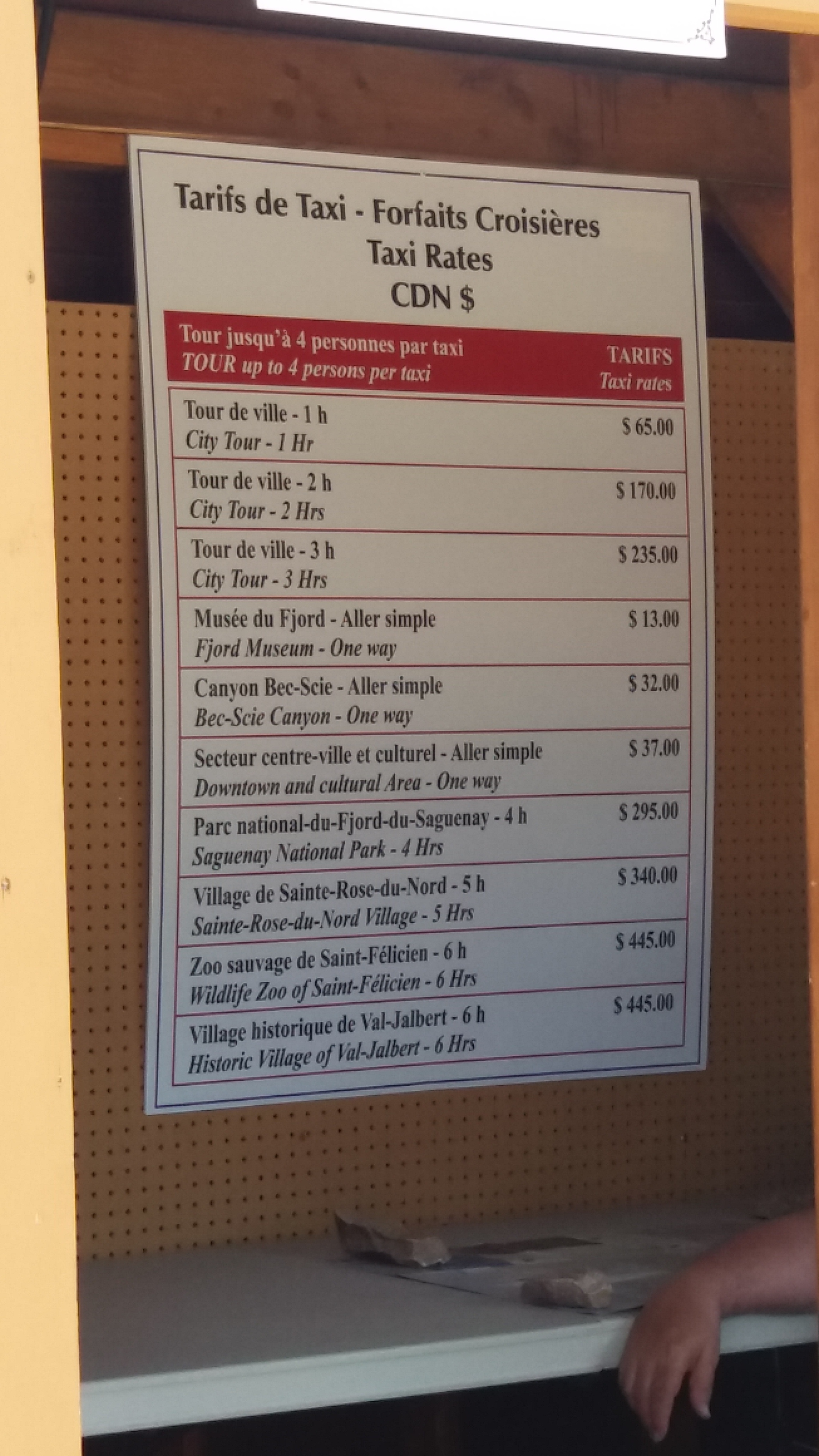 An der netten Touristeninformation im Hafenterminal kann man ein Auto buchen und auch direkt in Empfang nehmen. Der Preis betrug 75 $ + 25 $ für die Versicherung. Die Autovermietung war "National". Man bekam eine Karte und wir sind damit in den Nationalpark gefahren. War ein toller Tag. Außerdem standen draußen Hop on hop off Busse, mit denen man die Umgebung von Saguenay erkunden konnte (20 $) und noch ein Touranbieter (Fjord de Monde), mit dem man auch noch spontan eine Inseltour für 99 $ machen konnte.