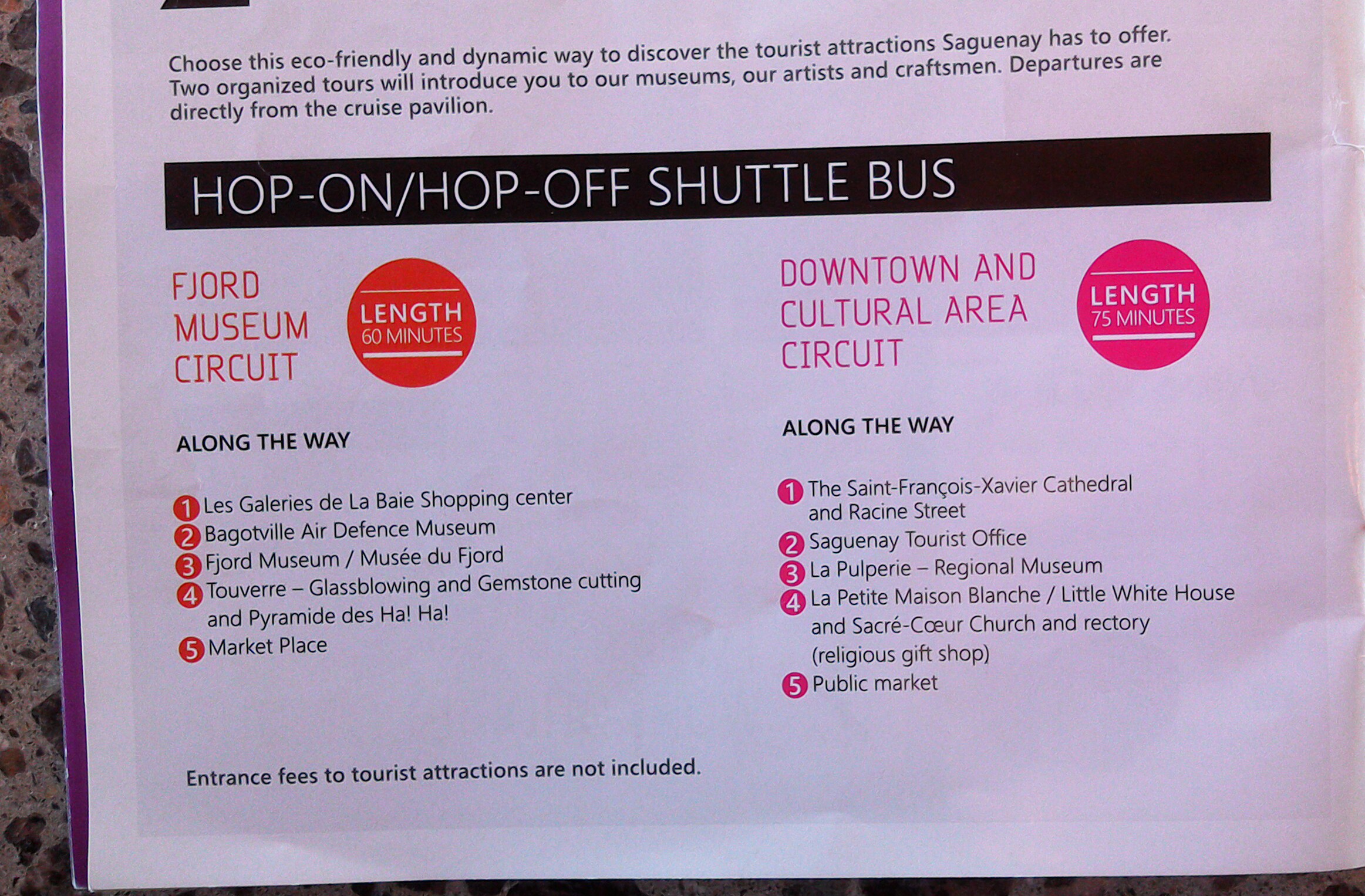 An der netten Touristeninformation im Hafenterminal kann man ein Auto buchen und auch direkt in Empfang nehmen. Der Preis betrug 75 $ + 25 $ für die Versicherung. Die Autovermietung war "National". Man bekam eine Karte und wir sind damit in den Nationalpark gefahren. War ein toller Tag. Außerdem standen draußen Hop on hop off Busse, mit denen man die Umgebung von Saguenay erkunden konnte (20 $) und noch ein Touranbieter (Fjord de Monde), mit dem man auch noch spontan eine Inseltour für 99 $ machen konnte.