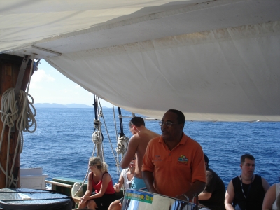 Unser Schiff hieß Scaramouche und hier ein Bild von unserer 1-Mann-Steeldrum-Band