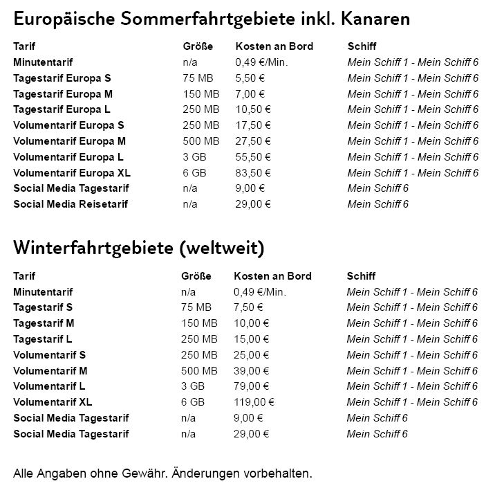 "...die Social Media Flat wird testweise auf der Mein Schiff 6 eingeführt. Im Anschluss an diese Testphase wird über eine flottenweite Umsetzung entschieden..."