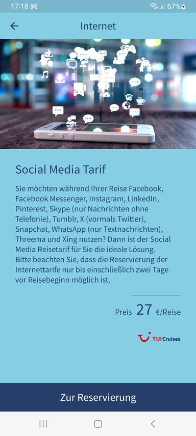 "Sie möchten während Ihrer Reise Facebook, Facebook Messenger, Instagram, LinkedIn, Pinterest, Skype (nur Nachrichten ohne Telefonie), Tumblr, X (vormals Twitter), Snapchat, WhatsApp, Threema, iMessage und Xing nutzen? Dann ist die Social Media Flat, die Sie mit bis zu zwei Endgeräten gleichzeitig nutzen können, für Sie die ideale Lösung."