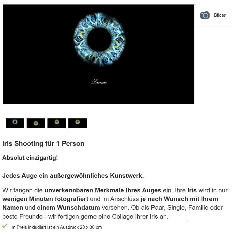 Habe das auf der Mar auch gesehen. Das Wort einzigartig bezieht sich auf die Iris. Die ist einzigartig wie ein Fingerabdruck. So die Beschreibung dort. Es waren auch einige Bilder ausgestellt. Geschmackssache, da keinerlei Wiedererkennungswert. Aber interessante Fotos.