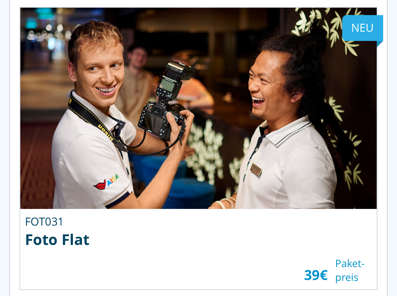 es gibt wohl auf AIDAprima, AIDAnova und AIDAcosma derzeit eine neue Digitale Foto Flat, in der alle Bilder, welche vom Fototeam aller "Kabineninsassen" geschossen weden zum Gesamtpreis von 39,00 Euro pro Kabine enthalten sind. (max. 4 Personen pro Kabine)