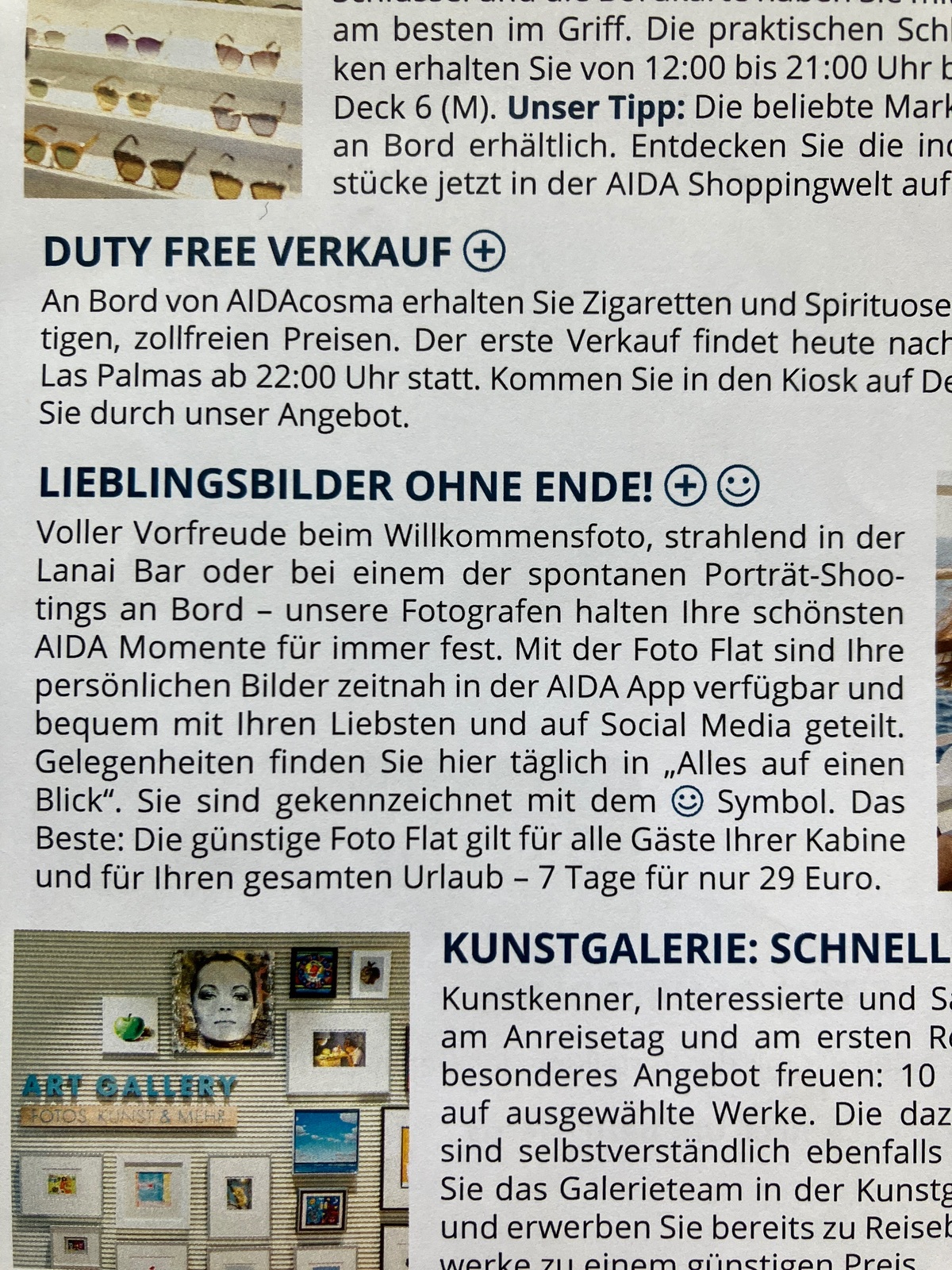 Und hier noch ein Foto aus der Aidaheute vom Anreisetag. Da ist das Angebot für die Fotoflat beworben.