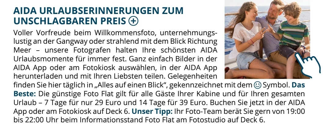 Das stimmt auch nicht immer. Auf der Prima waren gestern zeitgleich zwei Shootings: Seifenblasen und Aida-Buchstaben. Bei beiden stand in der Aida heute, dass diese in der Fotoflat inklusive sind. Wir haben dann nur die Seifenblasenfotos gemacht, eins reicht ja. Diese Fotos sind jedoch NICHT inklusive, war ein Fehler in der Aida heute. Wir hatten übrigens vor Änderung der AGB bereits gebucht. Finde ich nicht in Ordnung. Aida ist schnell fertig, wir hätten ja stornieren können