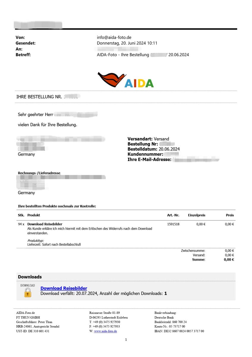 Dann soltest du einen Tag nach Rückkher bereits eine Nachricht von info@aida-foto.de erhalten (haben).