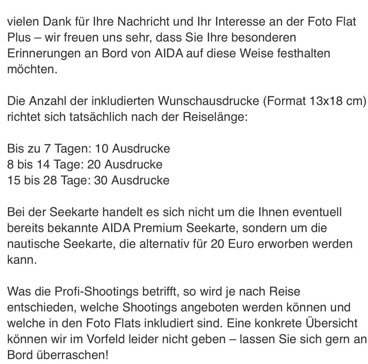Ich habe eben bei mir unter MyAida gesehen, dass bei der FotoFlat Plus dabei steht, dass "die nautische Seekarte 20x30" inbegriffen ist. Ist das die, die man sonst für 20 Euro im Fotoshop kriegt, mit der Unterschrift das Kapitäns und der Tabelle der Seemeilen? Oder die, die es in letzter Zeit immer gab, mit dem eigenen Foto?