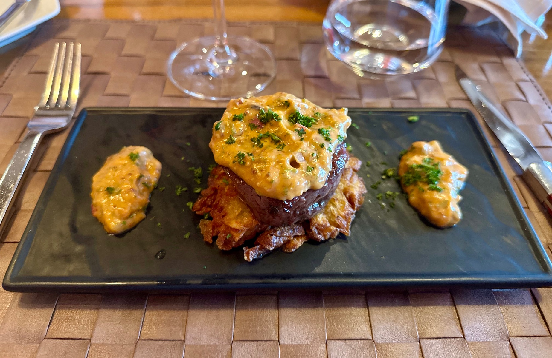 Wir hatten bei unserer Tour de Gourmet auf der Diva auch das Steaktartar im Buffalo Steak House. Das war ein Rösti, darauf ein kleines Steak und darauf eine Portion Tartar. Also quasi Vorspeise und Hauptgang auf einem Teller. Uns hat es geschmeckt. Tags zuvor hatten wir Tartar +Steak als Bestandteil des Menüs bei 3x3 im Steakhouse. Abgesehen von der Portionsgröße war da kein großer Unterschied.