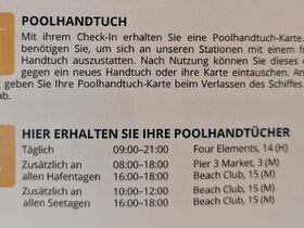 Auf der Perla gibt es beim Check-in eine Poolhandtuch Karte. Die muss beim Checkout an der Gangway wieder abgegeben werden. Es gibt tägliche Öffnungszeiten zum ausleihen/tauschen der Handtücher.